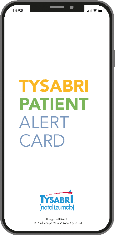 The Tysabri Patient Alert Card contains important safety information for you, your family & caregivers/healthcare professionals. You should always carry it with you, while you’re taking Tysabri and for 6 months after stopping Tysabri, and show it to any doctor involved in your treatment.